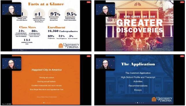 10月27日北京时间晚上八点,华二紫竹国际学院迎来University of Virginia美国弗吉尼亚大学的招生官Ms Clara Hoff 为同学带来线上宣讲。讲座由大学简介、学生占比情况、本科专业设置、申请要求以及问答环节组成。共计60多人参与了此次宣讲活动。